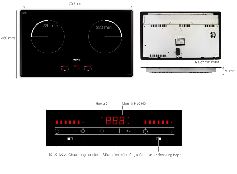 - Tự động chia sẻ công suất: Khi sử dụng cùng lúc hai vùng nấu, bếp tự động phân bổ công suất tối ưu (tổng 3600W), đảm bảo hiệu suất cao nhưng vẫn an toàn cho hệ thống điện gia đình.