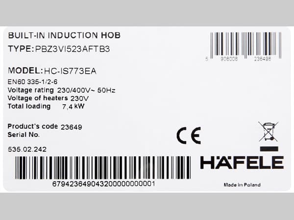 - Mỗi sản phẩm bếp từ Hafele chính hãng đều được in đầy đủ và rõ ràng các thông tin quan trọng trên thân máy hoặc bao bì, bao gồm: model cụ thể, số series riêng biệt, ngày sản xuất, quốc gia lắp ráp và mã vạch tiêu chuẩn quốc tế.