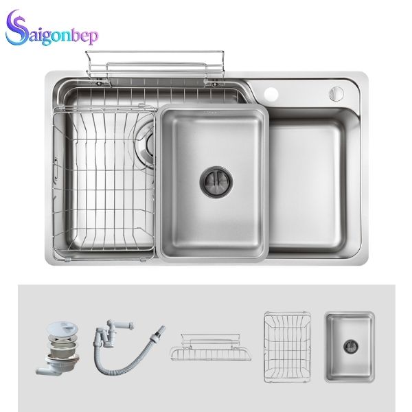 - 2 giỏ inox để đồ – hỗ trợ sắp xếp dụng cụ bếp như bàn chải, xà phòng, giúp khu vực trong chậu sạch sẽ, gọn gàng.
