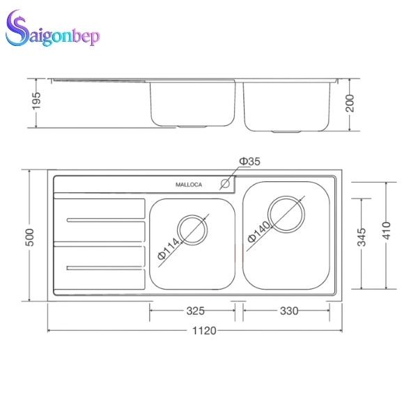 Thiết kế chậu rửa chén Malloca hai hộc tiện lợi: cho phép phân loại chén bát, rau củ khi rửa.