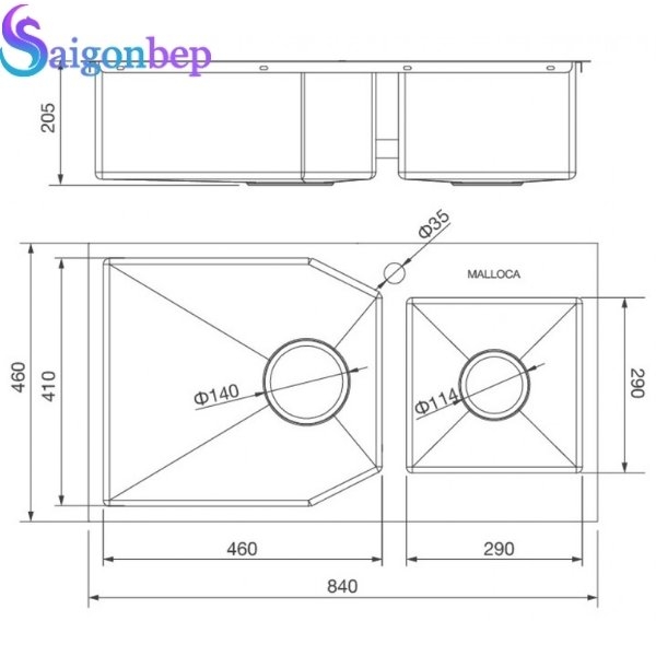 - Kích thước chậu tiêu chuẩn W840xD460xH205mm (kích thước lỗ đá: W820xD440mm) dễ dàng lắp đặt, phù hợp với nhiều loại không gian bếp khác nhau.
