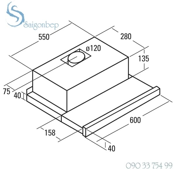 Kích thước: rộng: 60 cm x sâu: 28 cm (43.8 cm khi sử dụng thanh trượt tăng kích thước vùng hút), đường kính ống thoát khói: 12 cm